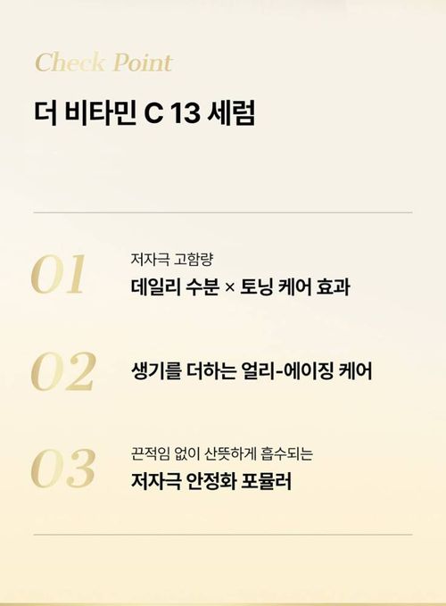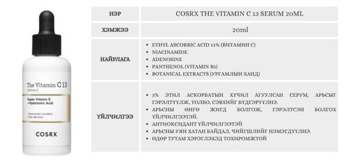 Арьсны өнгө жигд байдлыг нэмэгдүүлэх витамин C серум. 13% этил аскорбатын хүчил агуулсан хүчирхэг серум, арьсыг гэрэлтүүлж, толбо, сэвхийг бүдгэрүүлнэ. Арьсны өнгө жигд болгож, гэрэлтсэн болгох үйлчилгээтэй.