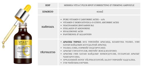 Цайруулж, толбо арилгах үйлчилгээтэй витамин C-ийн өндөр агууламжтай ампуль. Коллаген нийлэгжилтийг дэмжиж, арьсны уян хатан байдлыг нэмэгдүүлдэг. Арьсны өнгийг гэрэлтүүлж, жигд болгох нөлөөтэй. Батганы сорви, сэвх, нарны толбыг бүдгэрүүлж, арьсыг сэргээдэг.