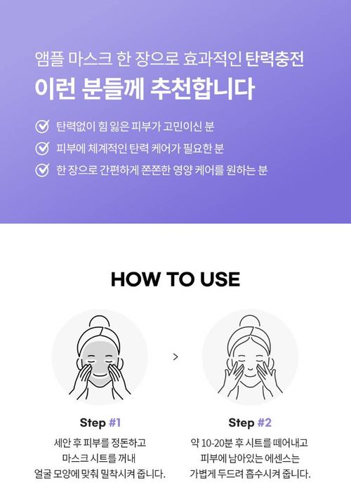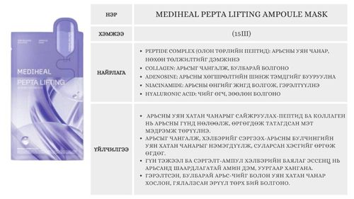 Гоо сайхны салоны түвшний лифтинг арчилгааг гэртээ авах боломжтой Уян хатан чанар алдсан арьсыг чангалж, өргөж татах үйлчилгээтэй ампул төрлийн маск. Коллаген болон олон төрлийн пептид (peptide complex) найрлага нь арьсны эсийн нөхөн төлжилтийг дэмжиж, уян хатан, булбарай болгодог.