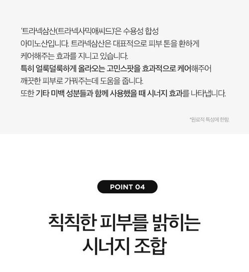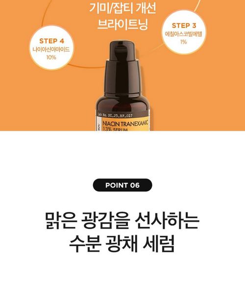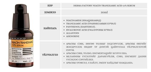 Арьсны сэвх, нөсөө толбыг бүдгэрүүлж, арьсны өнгийг жигдрүүлэх өндөр үр дүнтэй цайруулах үйлчилгээтэй серум. 13% найрлага бүхий Niacinamide + Tranexamic Acid агуулсан. Мэдрэмтгий арьсанд тохиромжтой харшил өгөх орц агуулаагүй, хиймэл үнэр, өнгөгүй.