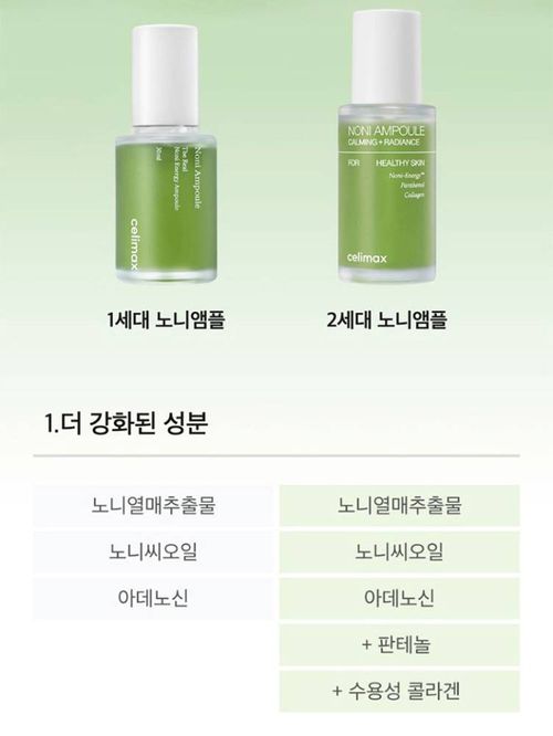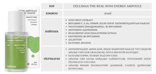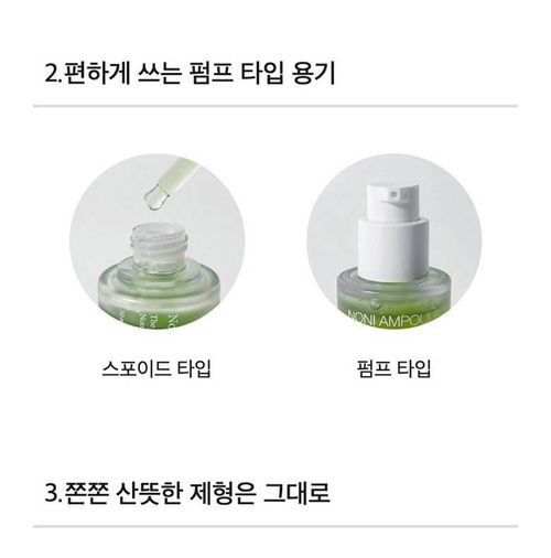 Noni fruit -ийн өндөр концентрацтай арьсны өнгө , уян хатан байдлыг сэргээх ампул юм. Антиоксидант, амин дэм, эрдэс бодисоор баялаг тул гандсан арьсыг сэргээж гялалзсан, эрүүл өнгөтэй болгодог. Химийн үнэр оруулагч, өнгө оруулагчгүй, мэдрэмтгий арьсанд ч тохиромжтой, зөөлөн найрлагатай.