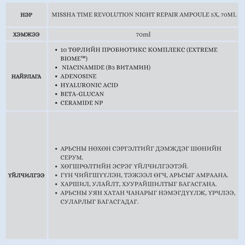 Арьсны нөхөн сэргэлтийг дэмждэг шөнийн серум. Хөгшрөлтийн эсрэг үйлчилгээтэй.Арьсны уян хатан чанарыг сэргээж, үрчлээг багасгана. Гүн чийгшүүлэлт, тэжээл өгч, арьсыг амраана.