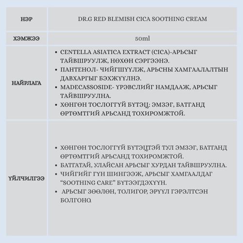 “Эмзэг, батгатай арьсанд зориулсан тайвшруулагч— Red Blemish Cica Cream” Цочирсон, улайсан, батгатай арьсыг тайвшруулан, хамгаалж, арьсны чийгшлийг сэргээдэг. Арьсыг зөөлөн, толигор болгож, батга үүсэхээс сэргийлнэ.