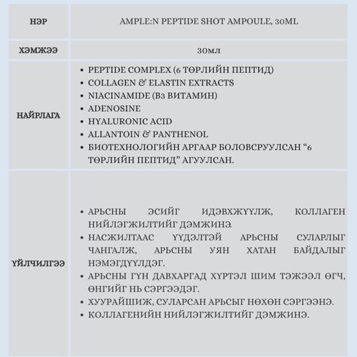 Арьсны уян хатан чанарыг сайжруулах “Пептидийн концентрацтай” серум. Арьсны эсийг идэвхжүүлж, коллаген нийлэгжилтийг дэмжинэ. Хөнгөн бүтэцтэй, наалдамхай биш тул бүх төрлийн арьсанд тохиромжтой.