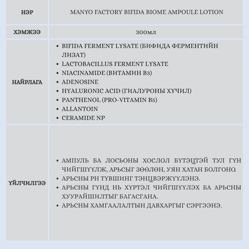 Бифида фермент болон пробиом комплекс агуулсан арьсны тэнцвэржүүлэгч, чийгшүүлэгч лосьон.Ампуль ба лосьоны хослол бүтэцтэй тул гүн чийгшүүлж, арьсыг зөөлөн, уян хатан болгож өгдөг.