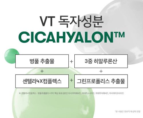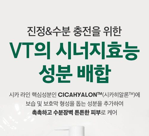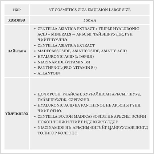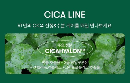 VT-ийн алдарт CICA LINE буюу эмзэг арьсыг тайвшруулах, хамгаалах үйлчилгээтэй. Centella Asiatica агуулсан бөгөөд арьсны гэмтлийг нөхөн сэргээж, улайлт, цочролыг намдаана. Харшил үүсгэгчгүй, үнэргүй, спиртгүй, парабенгүй учир эмзэг арьсанд ч тохиромжтой.