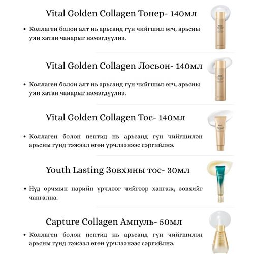 Golden Collagen Complex алттай коллагений нийлмэл бүтээгдэхүүн нь арьсны уян хатан байдлыг нэмэгдүүлэн арьсны гүнээс тэжээл өгч нарийн үрчлээг иж бүрэн шийдэх үйлчилгээтэй. Арьсны уян хатан чанар +50% сайжирна. Нарийн үрчлээ, хуурайшилт буурна. Арьс гэрэлтсэн, булбарай, залуужуулах үйлчилгээтэй.
