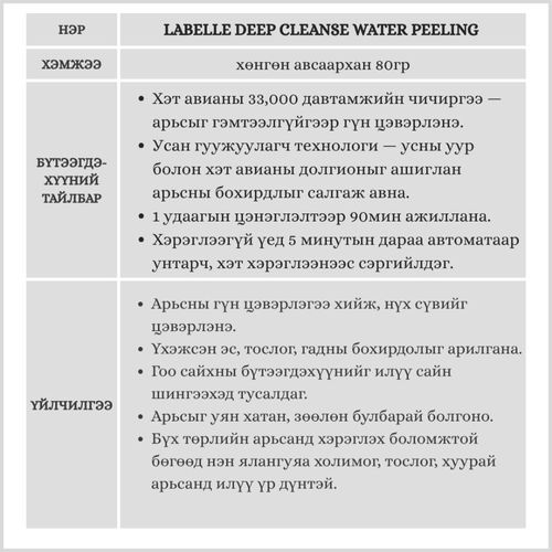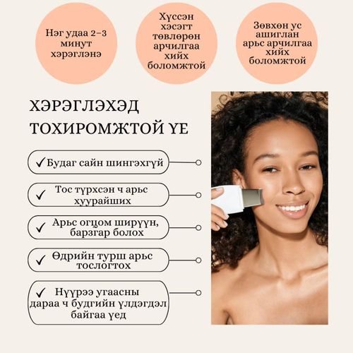 “Салоны арчилгааг гэртээ — таны арьсыг гялалзсан, цэвэр, эрүүл болгоно.” Хэт авиан давтамжын тусламжтайгаар арьсанд усан цэвэрлэгээ гүн гуужуулалт хийдэг төхөөрөмж бөгөөд арьсны бохирдол, үхэжсэн хэсгийг гүнээс нь зөөлөн цэвэрлэж, арьсыг дахин төрсөн мэт гялалзсан, толигор болгоно.