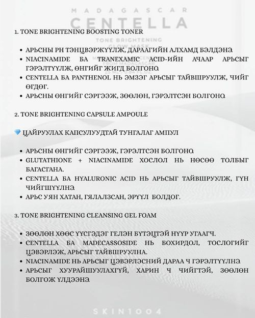 Эмзэг арьсыг тайвшруулж, арьсны өнгийг жигд болгон, нөсөө толбыг бүдгэрүүлдэг хүчтэй цайруулагч найрлага бүтээгдэхүүн. Гүн чийгшүүлж, арьсны уян хатан чанарыг сайжруулна.Арьсыг тайвшруулж, улайлт, үрэвсэл дарах үйлчилгээтэй.