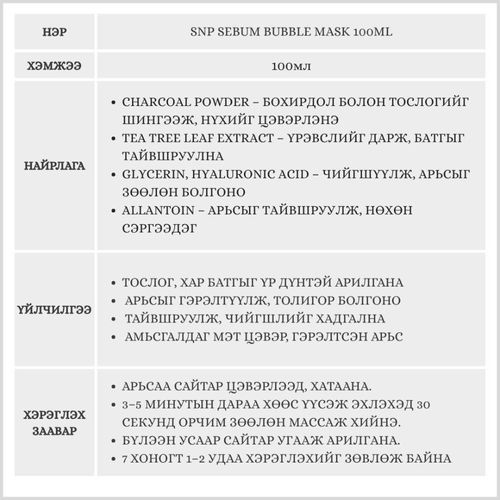 SNP Sebum Bubble Mask нь нүхний бохирдлыг хөөсөөр гүн цэвэрлэдэг өөрөө хөөсөрдөг маск юм. Хөөсөөр арьсны гүнд нэвчин, тослог, хар батгыг татаж гаргаж, арьсыг илүү цэвэр, толигор, гэрэлтсэн болгоно
