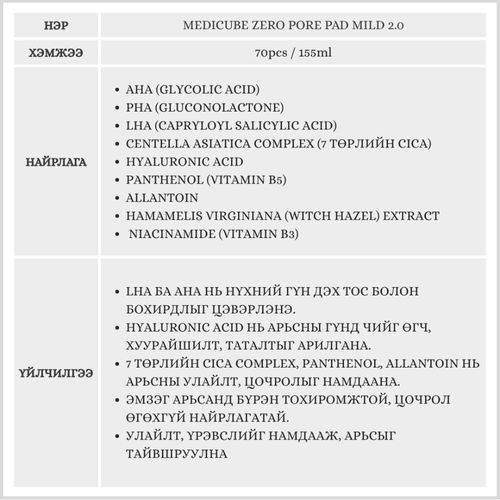 Нүхийг агшаах, арьсыг тайвшруулах пад эмзэг, мэдрэмтгий арьсанд зориулсан шинэчлэгдсэн бүтээгдэхүүн (2.0). 7 төрлийн Centella Asiatica (CICA) complex арьсыг тайвшруулж, улайлт, үрэвслийг багасгадаг. Нүх агшаах + Sebum control + Moisturizing 3in1 үйлчилгээтэй.