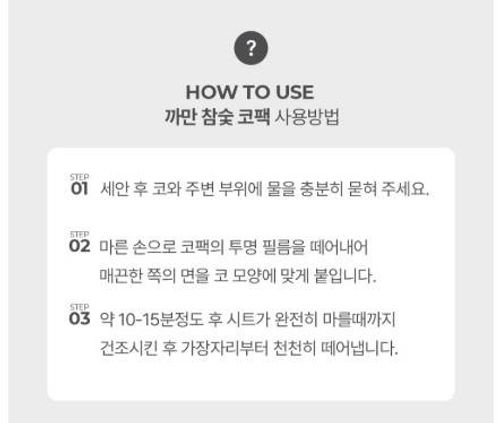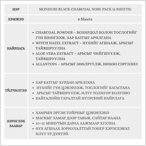 Хар батга, тослог болон нүхний бохирдлыг гүн цэвэрлэж, арьсыг цэвэр, толигор, уян хатан болгодог хамрын маск юм. Charcoal (модны нүүрс) найрлага нь нүх доторх бохирдол, тослогийг шингээж, арьсыг гүн цэвэрлэхийн зэрэгцээ хар батгыг үр дүнтэй арилгана.