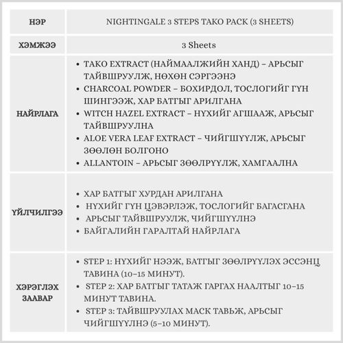 Хар батга, тослог болон нүхний бохирдлыг 3 шат дарааллаар гүн цэвэрлэж, арьсыг цэвэр, толигор, уян хатан болгодог иж бүрэн хамрын арчилгаа юм. Tako (наймаалжийн ханд) нь арьсыг тайвшруулж, нүхийг цэвэрлэн агшаах үйлчилгээтэй.