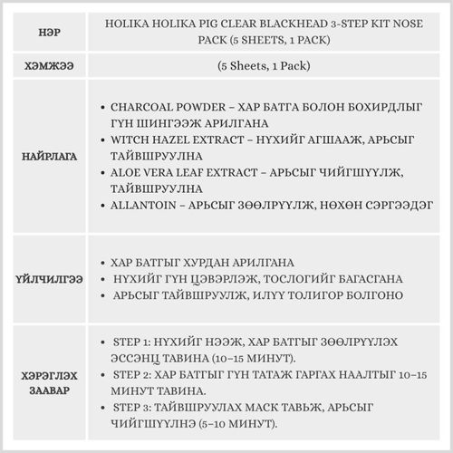 Хар батга, нүхний бохирдлыг 3 шат дарааллаар гүн цэвэрлэж, арьсыг цэвэр, толигор, сэргэлэн болгох иж бүрэн хамрын маск юм. Pig Nose Design нь наалтыг арьстай илүү сайн наалдуулах ба 3 шат бүтэц нь хар батгыг үр дүнтэй арилгаж, арьсыг тайвшруулж, чийгшүүлнэ.