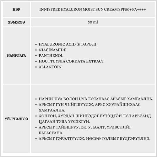 Innisfree Hyaluron Moist Sun Cream SPF50+ PA++++, 50ml