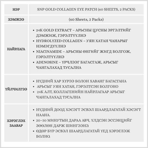 24K алт болон коллагенийн найрлагатай нүдний маск бөгөөд арьсыг чангалах, уян хатан болгох, хар хүрээ болон хаван бууруулах үйлчилгээтэй. Арьсанд гүн чийгшил өгч, нүдний орчмыг гэрэлтсэн, толигор, амарсан мэт харагдуулна.