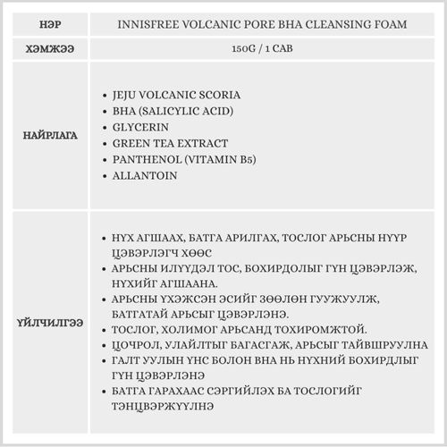 Нүх агшаах, батга арилгах, тослог арьсны нүүр цэвэрлэгч хөөс. Нүх агшаах, батга арилгах, тослог арьсны нүүр цэвэрлэгч хөөс арьсны илүүдэл тос, бохирдолыг гүн цэвэрлэж, нүхийг агшаана. Арьсны үхэжсэн эсийг зөөлөн гуужуулж, батгатай арьсыг цэвэрлэнэ. Тослог, холимог арьсанд тохиромжтой.