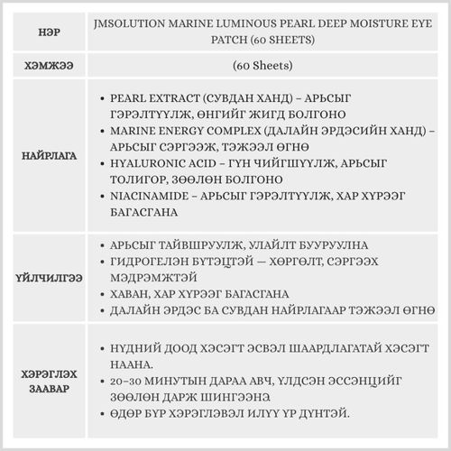 Далайн эрдэс, жинхэнэ сувдны ханд, гиалуроны хүчил агуулсан нүдний маск бөгөөд арьсыг чийгшүүлж, гэрэлтсэн, толигор болгоно. Хөнгөн гидрогелэн бүтэцтэй тул арьсанд сайн наалдаж, нүдний доорх ядаргаа, хаван, хар хүрээг багасгаж, амарсан мэт болгоно.