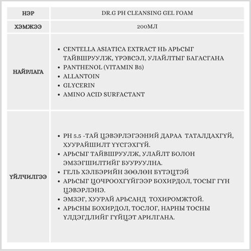 Эмзэг, хуурай, арьсанд зориулсан зөөлөн нүүр цэвэрлэгч гель. Cica Complex & Panthenol арьсыг тайвшруулж, улайлт болон эмзэгшилтийг бууруулна. Арьсны бохирдол, тослог, нарны тосны үлдэгдлийг арилгана.