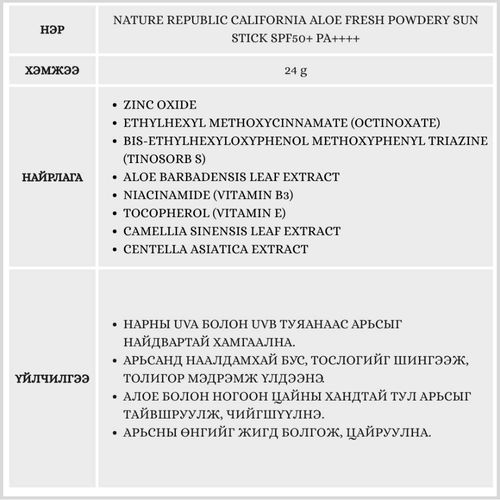 Калифорнийн алоеийн ханд агуулсан, арьсыг тайвшруулж, нарны туяанаас найдвартай хамгаалах нарны стик. Арьсыг тослоггүй, зөөлөн, гөлгөр байлгаж, чийгшүүлнэ. Ус болон хөлсөд тэсвэртэй тул өдөр бүрийн хэрэглээнд тохиромжтой.