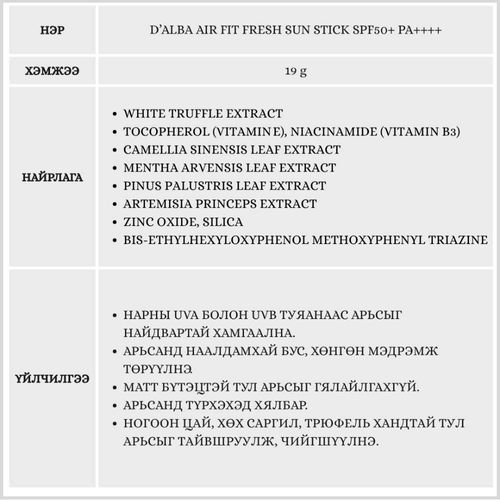 Нүүр болон биеийн арьсандаа хэрэглэх боломжтой, хөнгөн бүтэцтэй, нарны хэт ягаан туяанаас хамгаалах стик. Ургамлын ханд найрлагадаа агуулсан тул арьсыг тайвшруулж, чийгшүүлнэ.