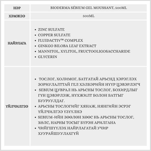 Тослог, холимог, батгатай арьснд хэрэглэх зориулалттай гел хэлбэрийн нүүр цэвэрлэгч. Sebium-ийн зөөлөн хөөс нь арьсны тослог, хөлс, нарны тосыг бүрэн арилгана. Zinc болон Copper-ийн нөлөөгөөр нянгийн эсрэг үйлчилгээ үзүүлж, батга гарахаас хамгаална.