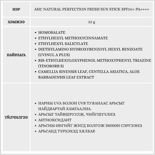 Арьсыг нарны хэт ягаан туяанаас найдвартай хамгаалах стик. Алое, ногоон цайны хандтай тул арьсыг маш сайн тайвшруулж, чийгшүүлнэ.