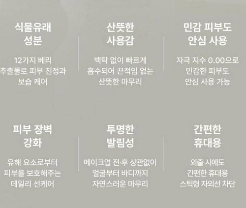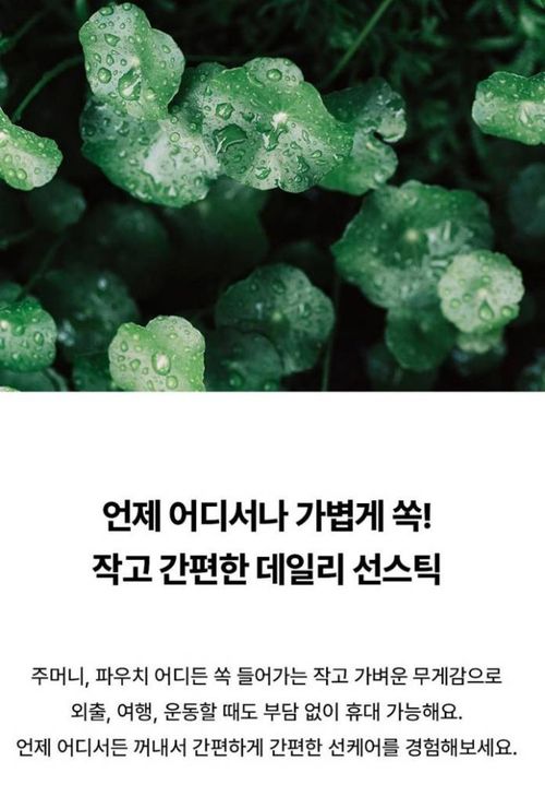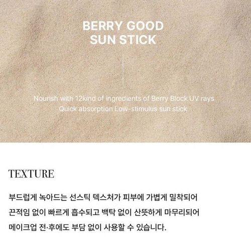 Органик болон физик шүүлтүүрийн технологийг ашигласан нарны хэт ягаан туяанаас хамгаалах нарны стик. Олон жимсны ханд агуулсан тул арьсыг тайвшруулж, арьсанд тэжээл өгнө. Наалдамхай бус хөнгөн бүтэцтэй.