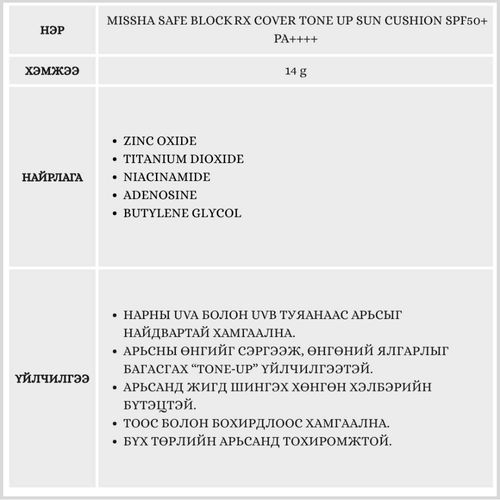 Физик шүүлтүүрын тусламжтай арьсыг нарны хэт ягаан туяанаас найдвартай хамгаалах cushion. Арьсны өнгийг сэргээж, торгомсог болгоно. Арьсны өнгийг жигд болгож, тоос ба бохирдлоос давхар хамгаална.