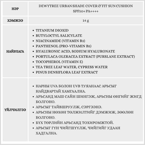 DEWYTREE Urban Shade Cover & Fit Sun Cushion SPF50+ PA++++, 14g