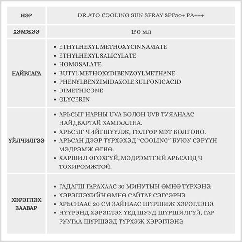 Нарны хэт ягаан туяанаас найдвартай хамгаалах шүршиж болон түрхэж хэрэглэх боломжтой нарны spray. Арьсанд түрхэхэд сэрүүн мэдрэмж өгөх ба арьсыг чийгшүүлж, гөлгөр мэт болгоно.