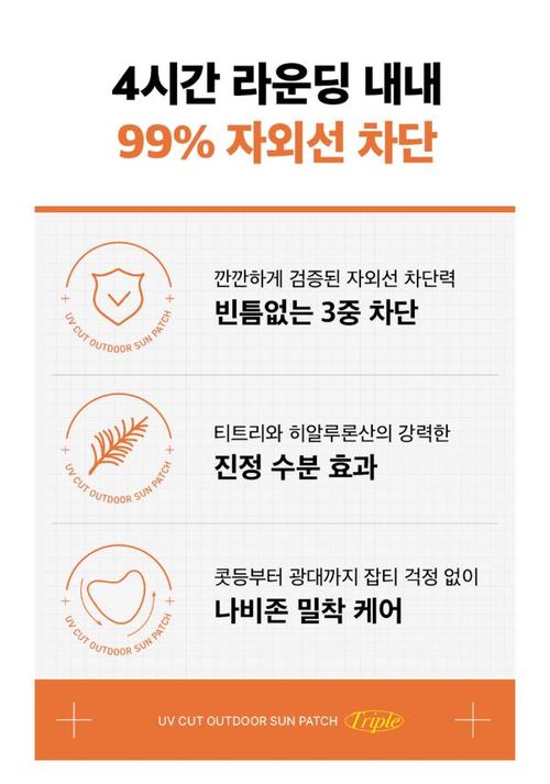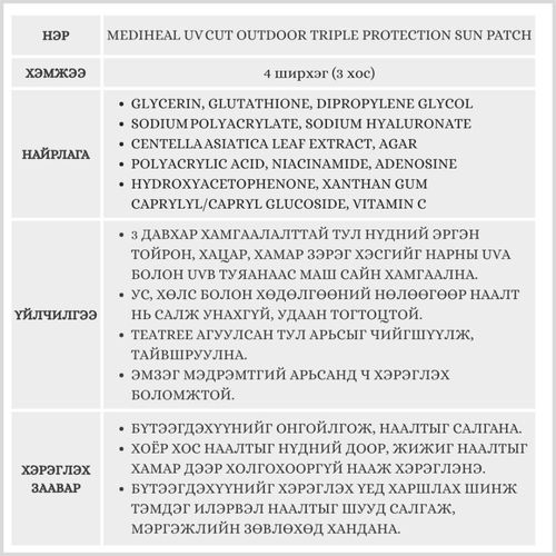 Хацар, хамар, нүдний эргэн тойрны арьсыг нарны хэт ягаан туяанаас хамгаалах гурван хос, гурвалсан хамгаалалт бүхий наалддаг patch. Ус, хөлс, хөдөлгөөний нөлөөгөөр салж унахааргүй удаан тогтоцтой. Teatree агуулсан тул арьсыг гүн чийгшүүлж, тайвшруулах ба эмзэг арьсанд ч хэрэглэхэд тохиромжтой.