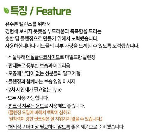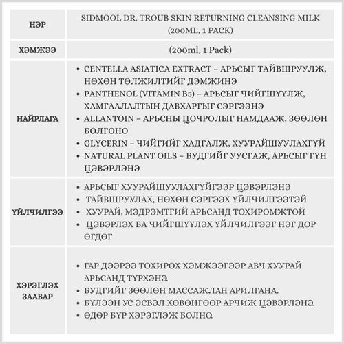 Ургамлын гаралтай тос болон чийгшүүлэгч найрлагаар баялаг, арьсны бохирдол, будгийг зөөлөн арилгаж, арьсны тос болон чийгний тэнцвэрийг хадгална. Мэдрэмтгий, хуурай арьсанд зориулсан энэхүү сүүн бүтэцтэй цэвэрлэгч нь арьсыг тайвшруулж, гүн чийгшүүлж, уян хатан болгоно.