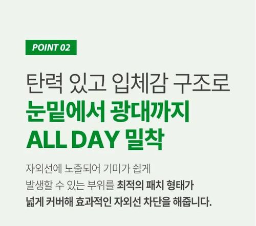 Нүд, хацрын эргэн тойрны хэсгийн арьсыг нарны хэт ягаан туяанаас хамгаалах наалддаг patch. Уян хатан бүтэцтэй тул гадна орчинд идэвхтэй хөдөлгөөн хийх үед ашиглах боломжтой ба салж унахгүй, удаан тогтоцтой. Ногоон цайны ханд агуулсан тул арьсыг чийгшүүлэхээс гадна цочирсон арьсыг тайвшруулна.