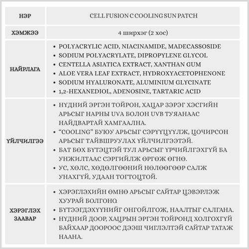 Нүд, хацрын эргэн тойрны хэсгийн арьсыг нарны хэт ягаан туяанаас хамгаалах наалддаг patch. "Cooling" үйлчилгээтэй тул наранд цочирсон арьсыг тайвшруулж, чийгшүүлэхээс гадна арьсыг сэрүүцүүлж өгнө. Бат бөх бүтэцтэй тул арьсыг өргөж өгөх ба үрчлээг тэнийлгэж, арьс унжилтаас сэргийлнэ.