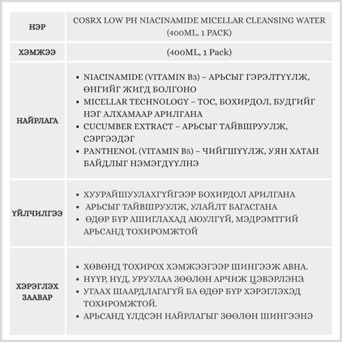 Өвөрмөц pH 5.5-ийн зөөлөн мицелляр цэвэрлэгч бөгөөд арьсыг тайвшруулж, бохирдол, тос, будгийг үлдэгдэлгүй арилгана. Niacinamide найрлага нь арьсны өнгийг жигд болгож, гэрэлтсэн арьсыг бий болгоно . Хуурай болон мэдрэмтгий арьсанд тохиромжтой.