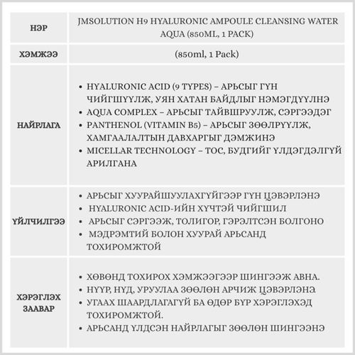 Өндөр концентрацтай Hyaluronic Acid агуулсан мицелляр ус бөгөөд, арьсны бохирдол, тос, будгийг зөөлөн арилгаж, арьсыг гүн чийгшүүлж, толигор, сэрүүн мэдрэмж өгдөг. Мэдрэмтгий болон хуурай арьсанд тохиромжтой.