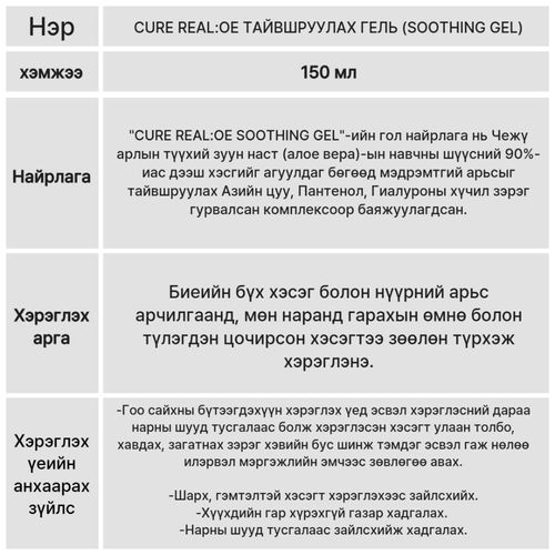 Чежү арлын 90%-иас дээш цэвэр зуун настын шүүс, мөн Тайвшруулах Гурвалсан Комплекс (Азийн цуу, Пантенол, Гиалуроны хүчил) агуулсан энэхүү гель нь мэдрэмтгий арьсыг тайвшруулж, чийгшүүлэн, наранд шарсны дараах болон арьсны цочролыг намдаах олон зориулалттай, наалдамхай бус бүтээгдэхүүн юм.