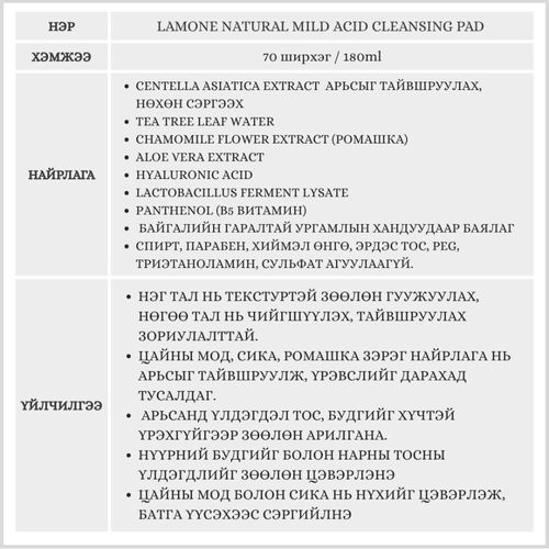 Lamone Natural Mild Acid Cleansing Pad, 70 ширхэг / 180ml