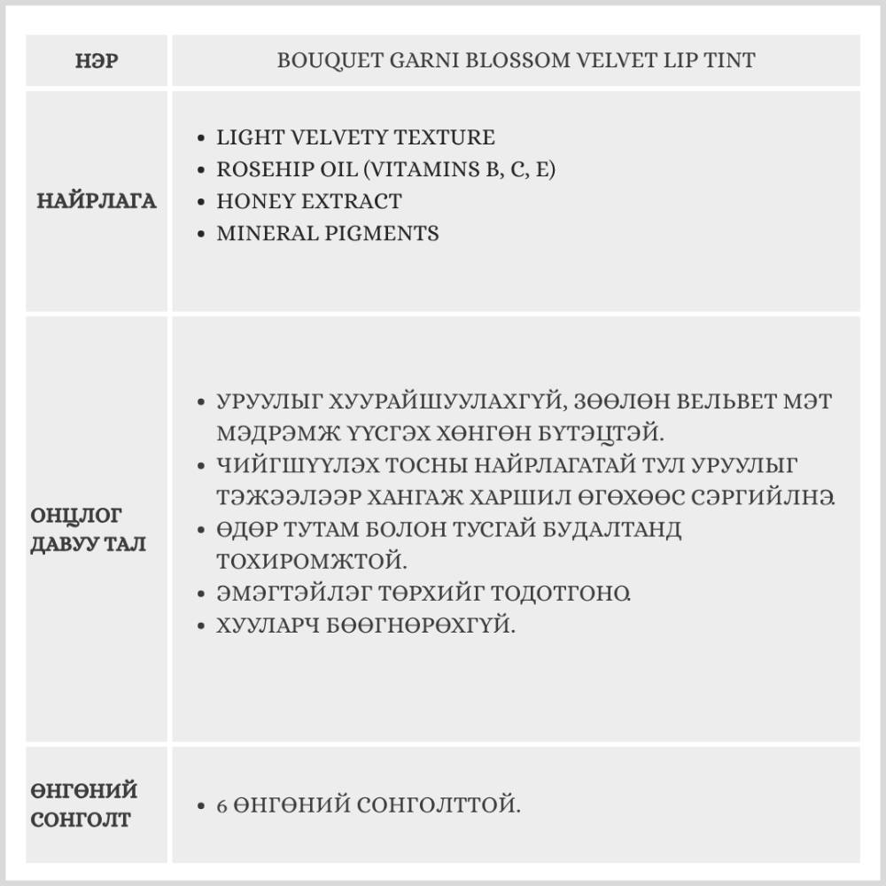 Зөөлөн велвет мэт мэдрэмж үүсгэх зөөлөн бүтэцтэй уруулын будаг