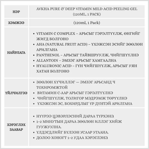 Витаминтай, бага хүчиллэг (pH-balanced) найрлагатай, арьсыг зөөлөн гуужуулж, өнгийг сэргээж, гэрэлтсэн болгодог зөөлөн гуужуулагч гель юм.