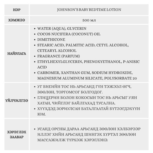 Энэхүү тос нь хүүхдийн арьсыг зөөлрүүлэн чийгшүүлж тайвшруулах үүрэгтэй бөгөөд унтахыг өмнө хэргэлвэл хүүхэд тайван тухтай амарна.