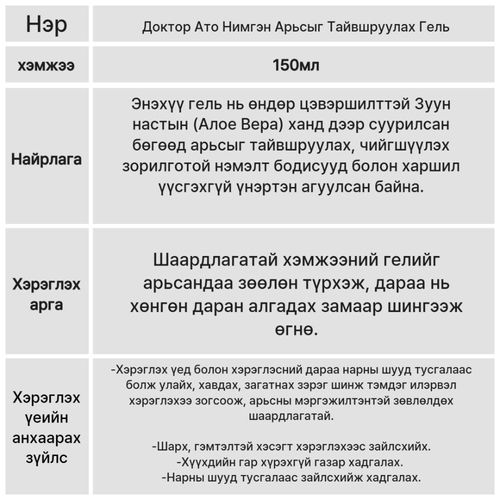 Доктор Ато Нимгэн Арьсыг Тайвшруулах Гель нь өндөр цэвэршилттэй Зуун настын хандмал (Алое Вера)-аар цочирсон арьсыг хурдан тайвшруулж, наалдамхай бишээр чийгшүүлдэг, цочролын индекс 0.00-тай маш зөөлөн бүтээгдэхүүн юм.