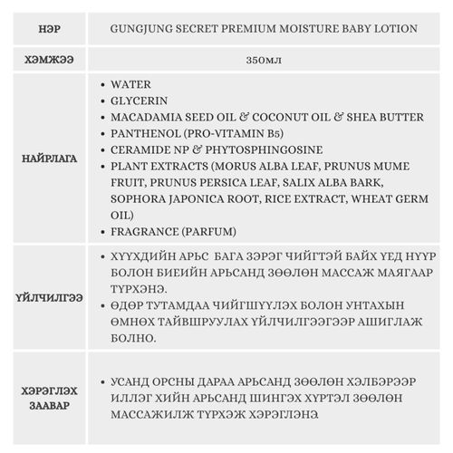 Хүүхдийн арьсыг зөөлөн чийгшүүлж, тайвшруулах үйлчилгээтэй.Өдөр тутамд болон унтахын өмнөх арчилгаанд зориулсан лосьон. 0-36сартай хүүхдүүдэд тохиромжтой бөгөөд 72цагийн турш чийгшүүлнэ.