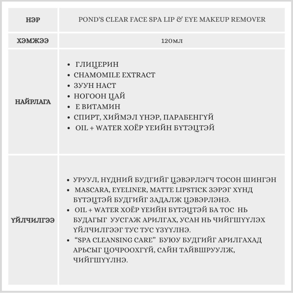 Нүд, уруулын усанд тэсвэртэй будгийг бүрэн арилгана. Oil + Water хоёр бүтэцтэй. Хөнгөн бүтэцтэй тул угаах шаардлагагүй, арьсыг цэвэрхэн байлгана. Спирт, үнэр, парабенгүй тул мэдрэмтгий арьсанд тохиромжтой.