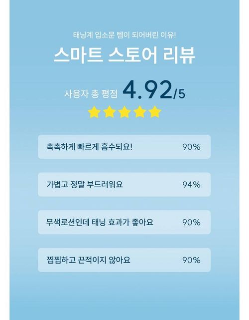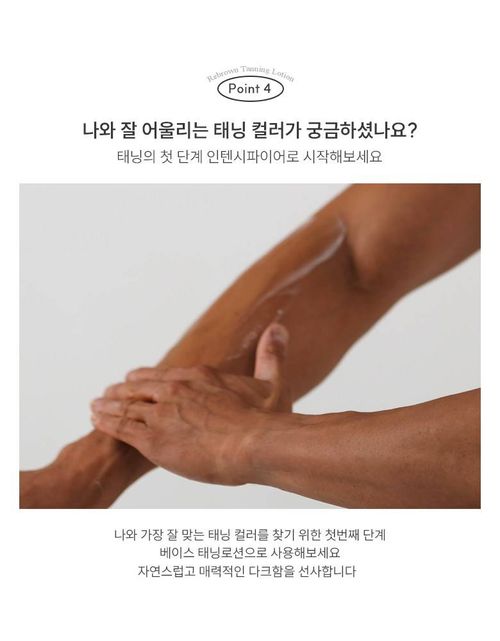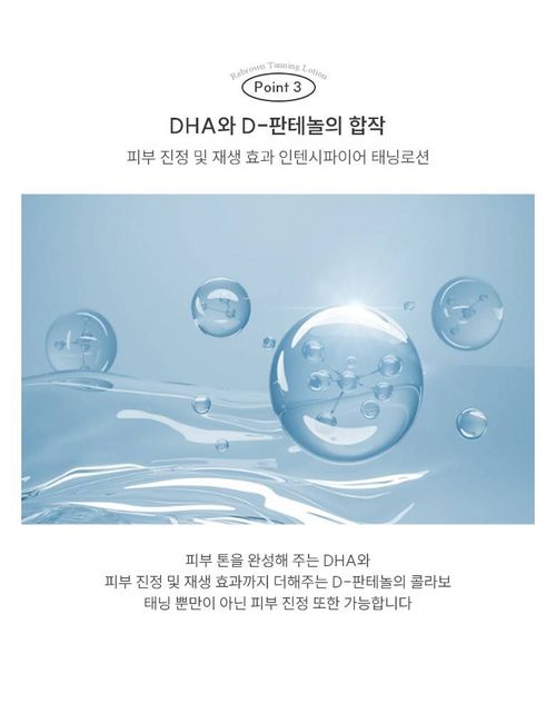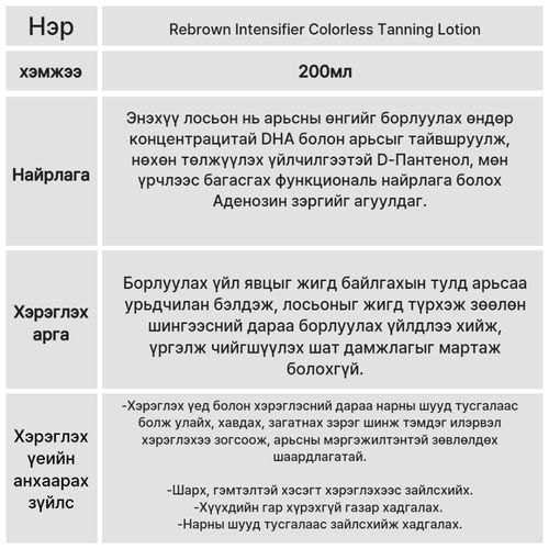 Энэхүү өнгөгүй борлуулах lotion нь хувцсанд толбо үүсгэхгүй тав тухыг хангахаас гадна, DHA болон D-Пантенолын хамтын үйлчилгээгээр арьсыг борлуулж, тайвшруулж, нөхөн сэргээх үйлчилгээг зэрэг үзүүлдэг.