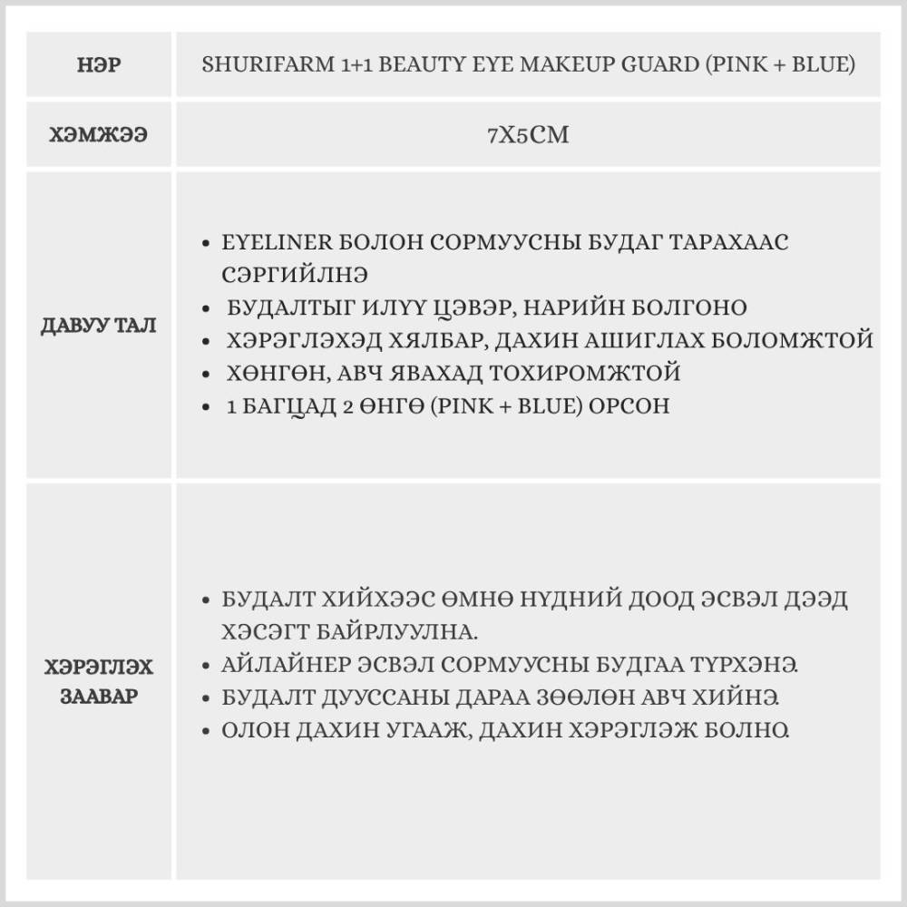 Будгийн алдааг март — төгс нүдний будалтыг Shurifarm Eye Makeup Guard-аар! Нүдний будалтыг илүү цэвэрхэн болоход туслаж будгийн алдаа гарахаас сэргийлнэ. Хөнгөн, уян хатан материалаар хийгдсэн тул арьсанд зөөлөн хэрэглэхэд тун хялбар.