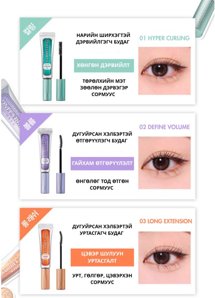 Сормуусыг дэрвийлгэж , хэлбэржүүлэх болон хэлбэрыг баригч үйлчилгээтэй сормуусны будаг. Сормуусыг наалдуулж, будаг бөөгнөрөхгүй цэвэрхэн жигд түрхэлттэй сормуусны будаг.