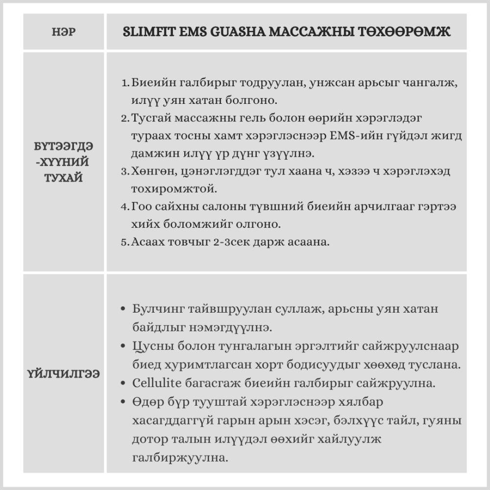 EMS (Electro Muscle Stimulation) технологи нь булчинг өдөөн, илүүдэл өөх, целлюлитийг задлан хайлуулдаг ба ГуаШа хэлбэр нь биеийн хэсэг бүрт нарийн хүрч үйлчилдэг. Турааж өөх хайлуулах зориулалтын тос дагалдана.