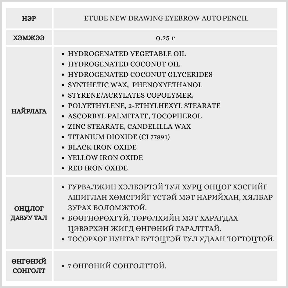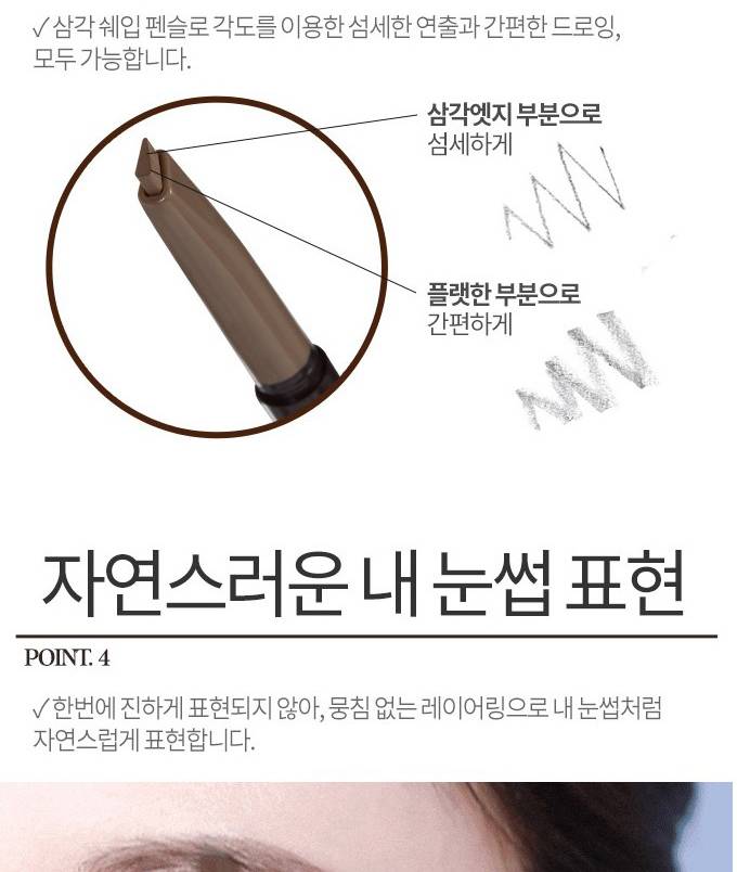Төрөлхийн мэт үс зурах боломжтой гурвалжин хэлбэртэй хөмсөгний харандаа. Бөөгнөрөхгүй, цэвэрхэн өнгөний гаралттай ба удаан тогтоцтой.
